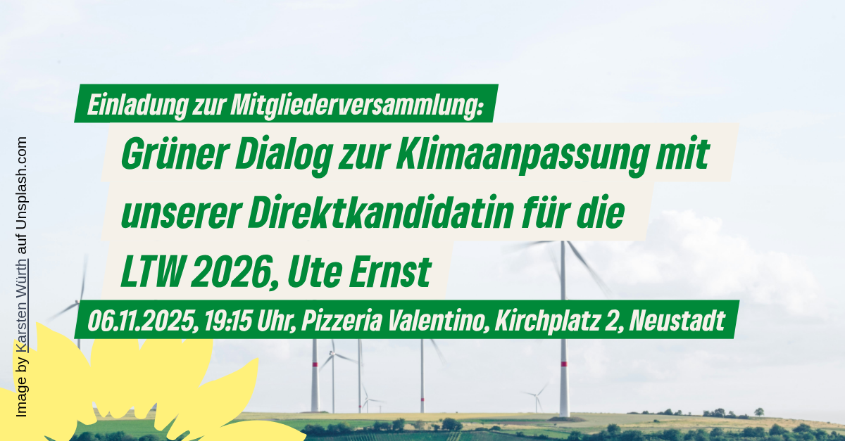 Besonders freuen wir uns, dass unsere Direktkandidatin für die Landtagswahl 2025, UTE ERNST, anwesend sein wird. Sie wird einen Ausblick auf ihre politischen Schwerpunkte eben und mit allen Anwesenden über grüne Ideen und Strategien für eine klimafitte Zukunft ins Gespräch kommen.