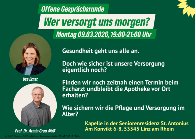 Diskutieren Sie mit Ute Ernst, Landtagsdirektkandidatin für den Wahlkreis 3 (Linz/Rengsdorf) und Prof. Dr. Armin Grau MdB.